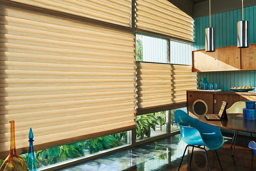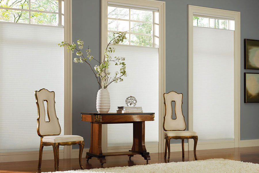 Cellular shades are made of non-woven soft fabric that creates a honeycomb ”cell”. These cells trap air for maximum energy efficiency and sound reduction. Hunter Douglas Duets, Comfortex Symphony, Honecomb Shades or pleats — whatever the name used or the fabricator that provides them, the value of cellular shades is the principle of energy efficiency. The soft, yet durable, shades are available in single, double and triple honeycombs. Choose from a wide variety of light filtering or room darkening fabrics in hundreds of colors. Available in several pleat sizes, with larger pleats offering more energy efficiency. When raised, cellular shades stack compactly, keeping your windows open to the view. Our cellular shades are available with Cordless One controls, which means no hanging cords on your shades.